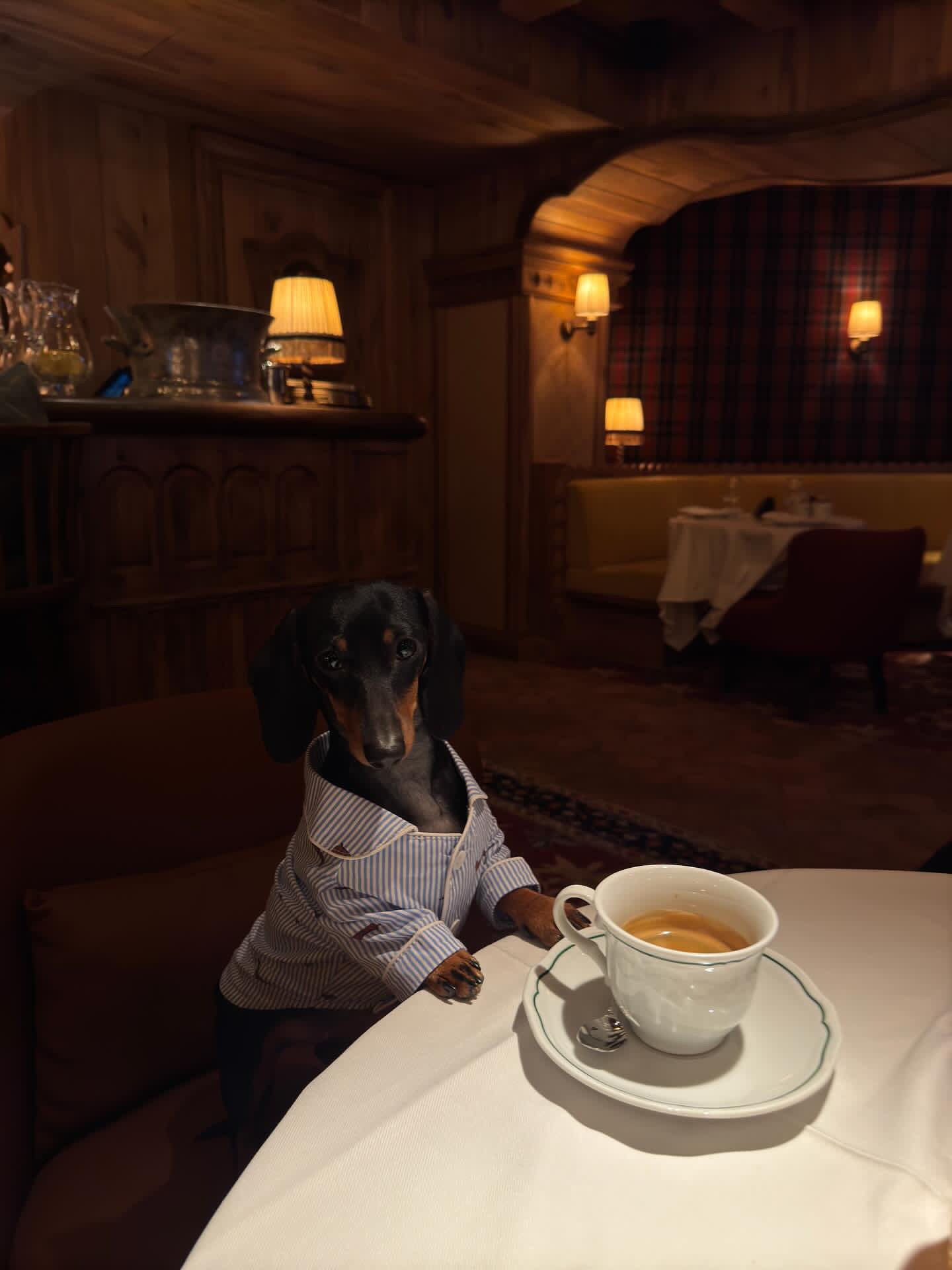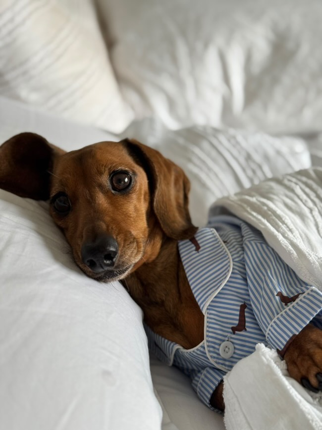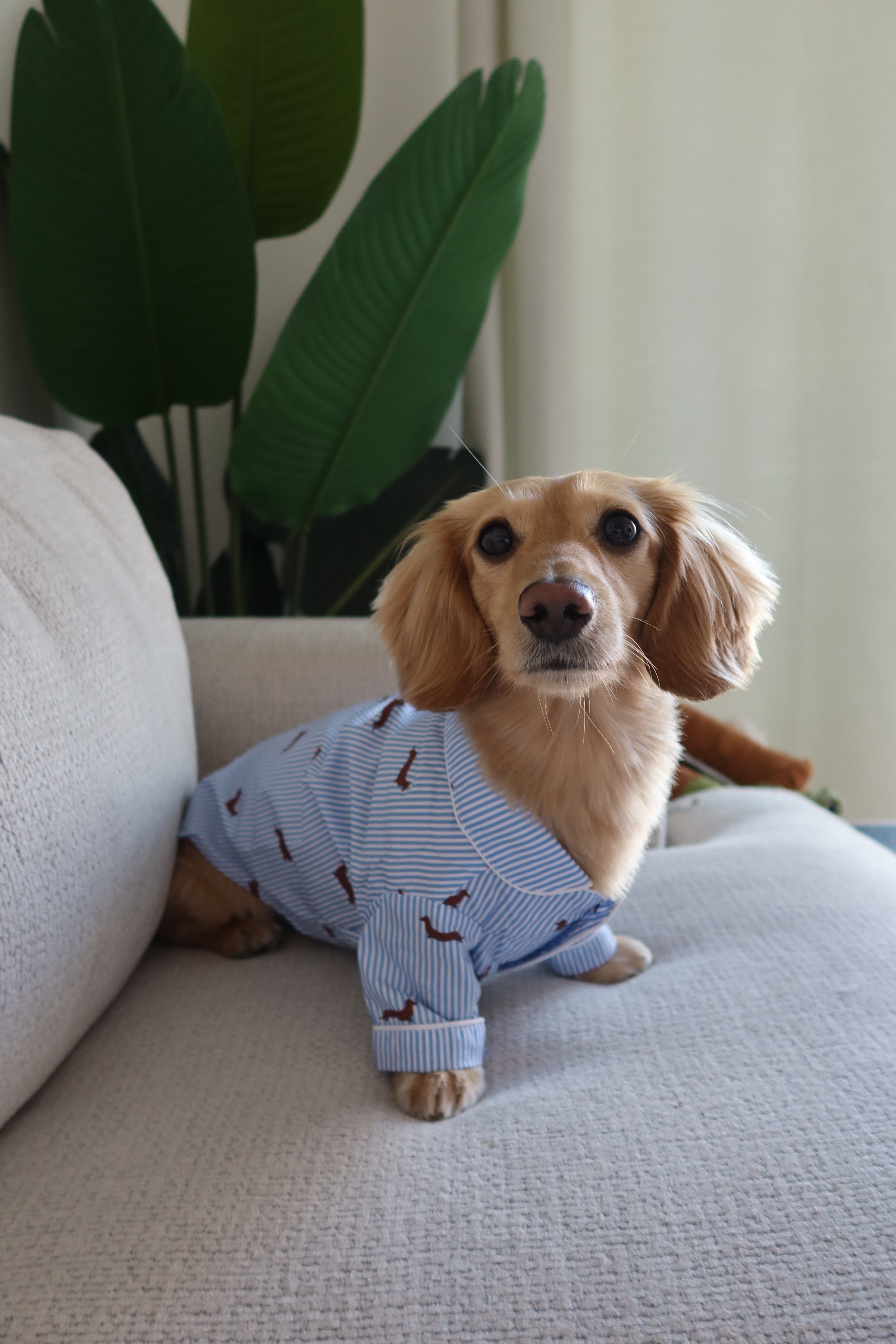 This unisex PJ set is made out of super-soft 100% premium cotton and has a classic straight cut. The base features a timeless blue and white stripe, complemented by a playful all-over Dachshund print.